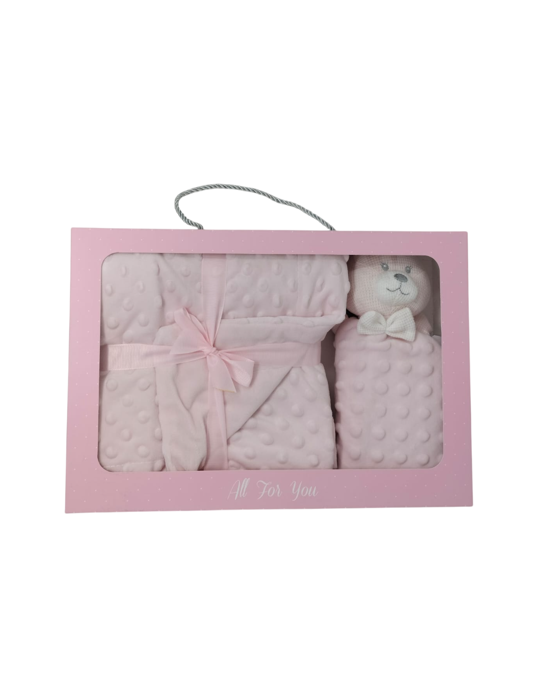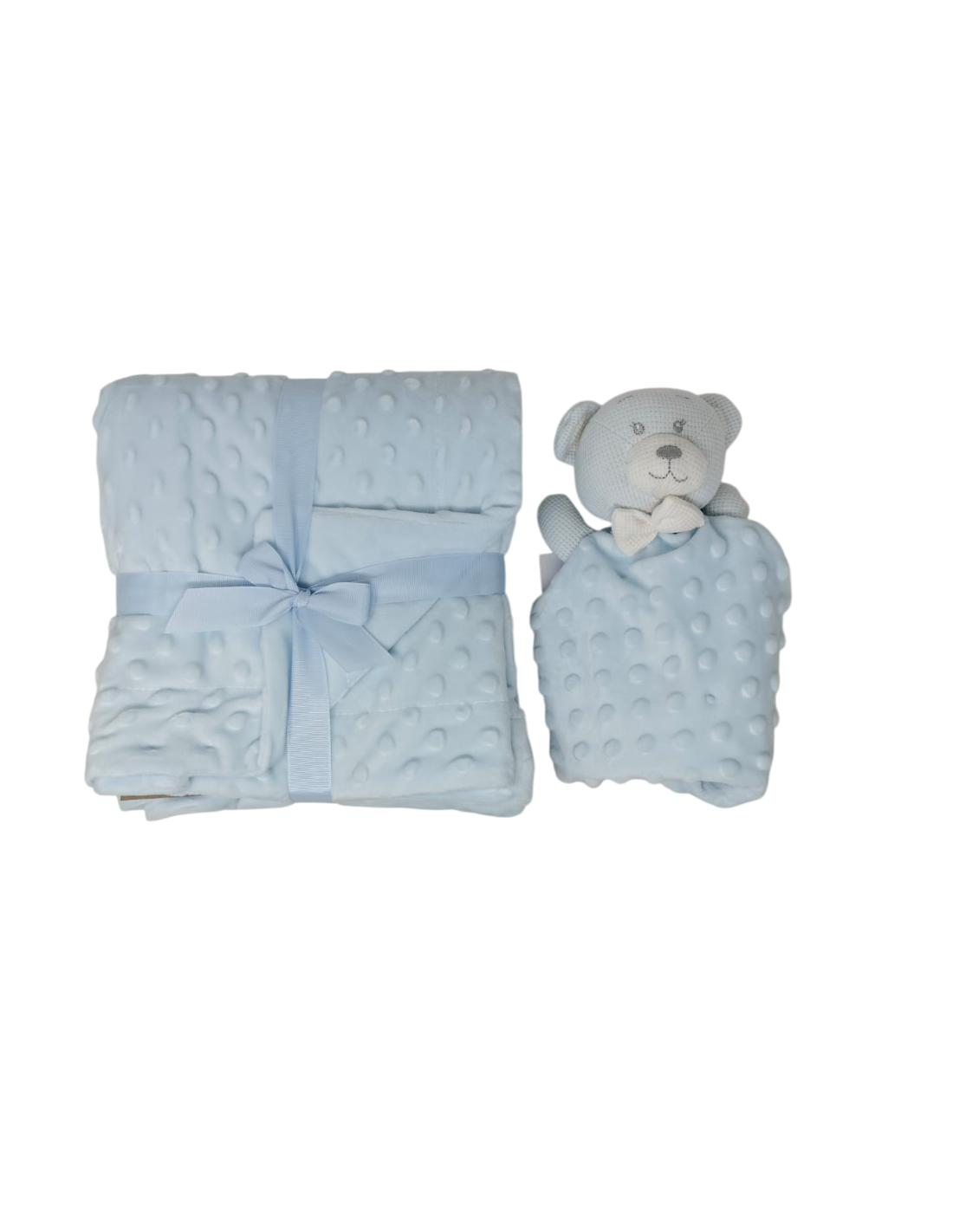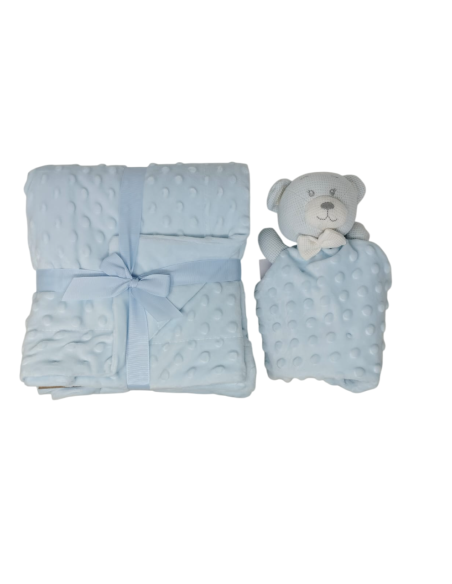 Caja de 12 sets de regalo compuesto por manta de topitos y dou dou de topitos con cabeza de crochet de oso.