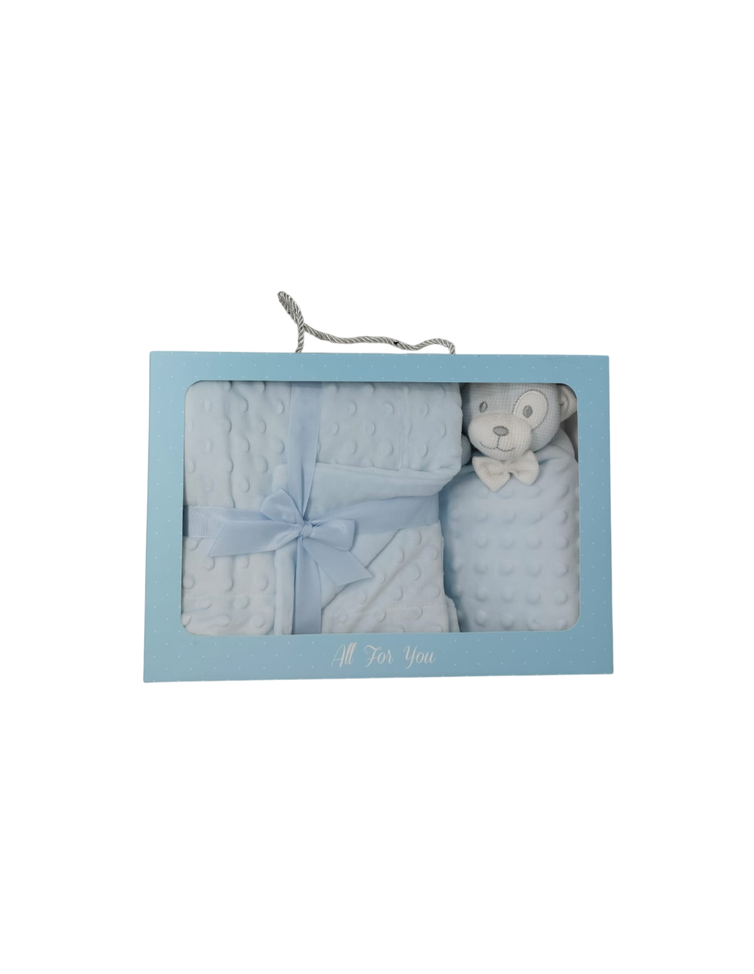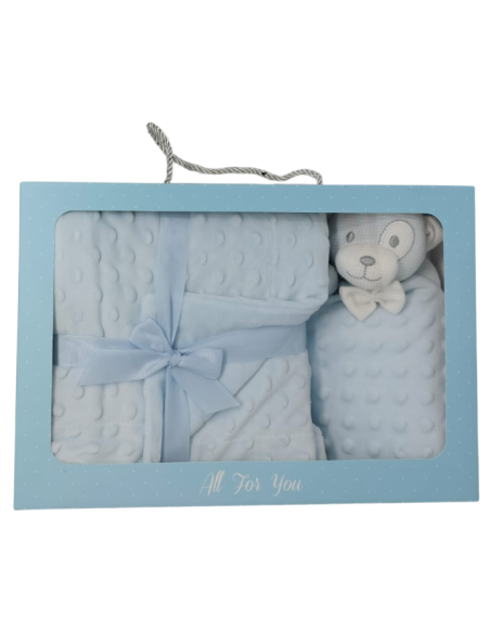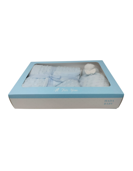 Caja de 12 mantas de topitos con dou dou de cabeza de crochet.
