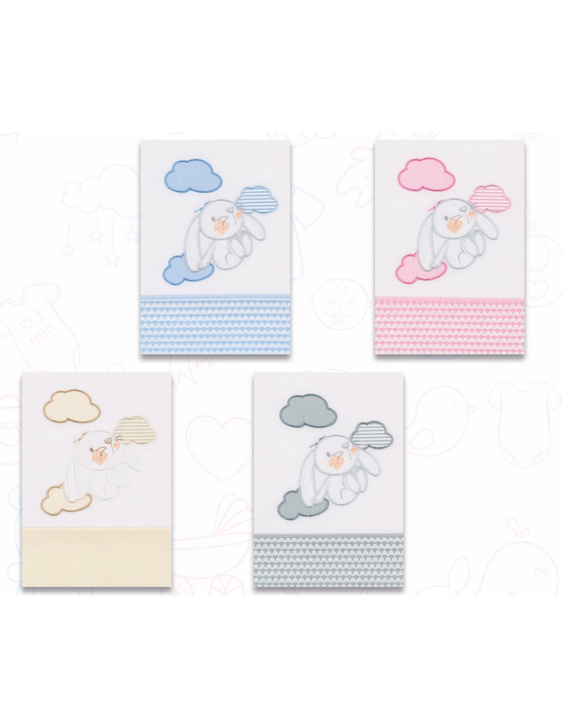 Con bordado de conejito y nubes.
