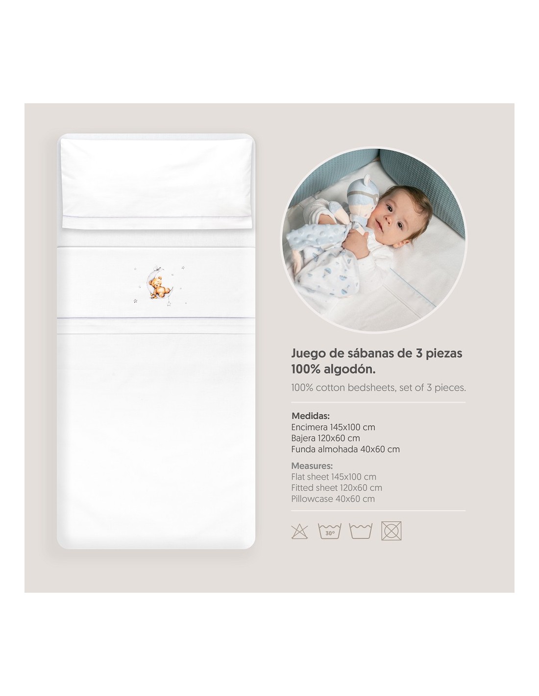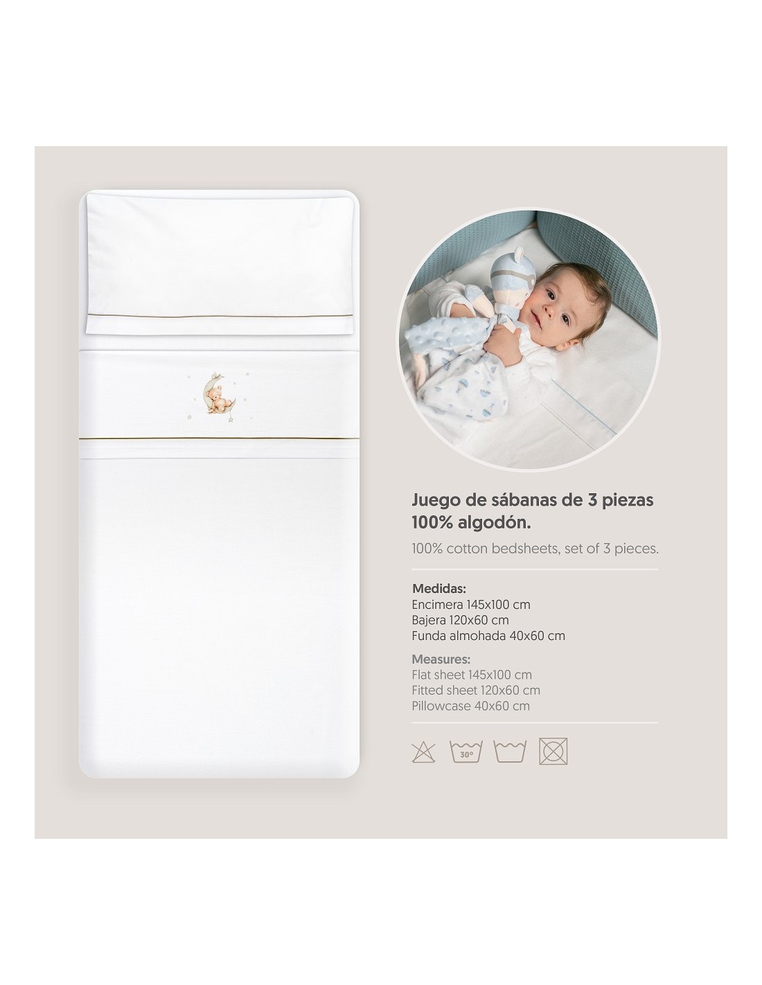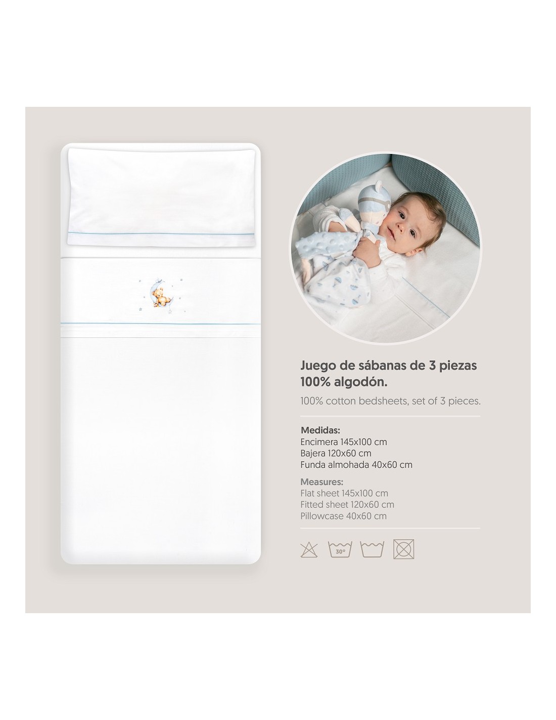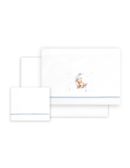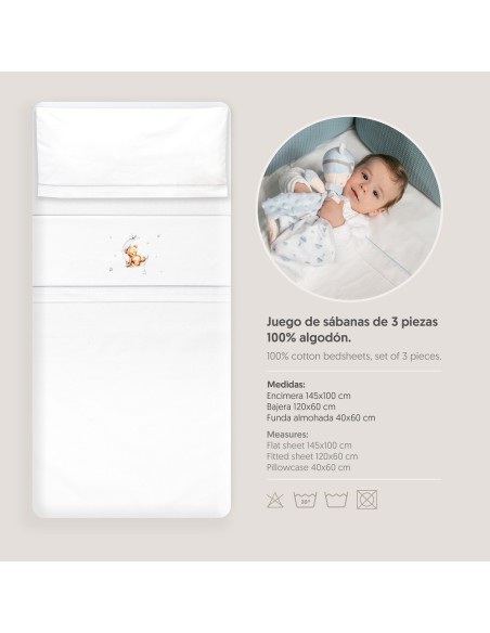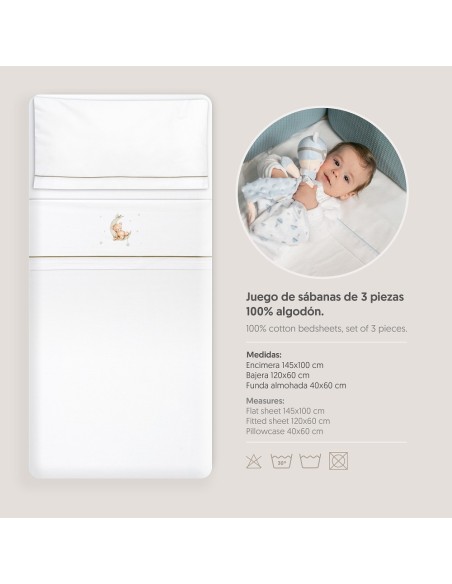 Juego de sábanas de algodón para cuna de bebé compuesto por: sábana bajera, sábana encimera y funda de almohada.
