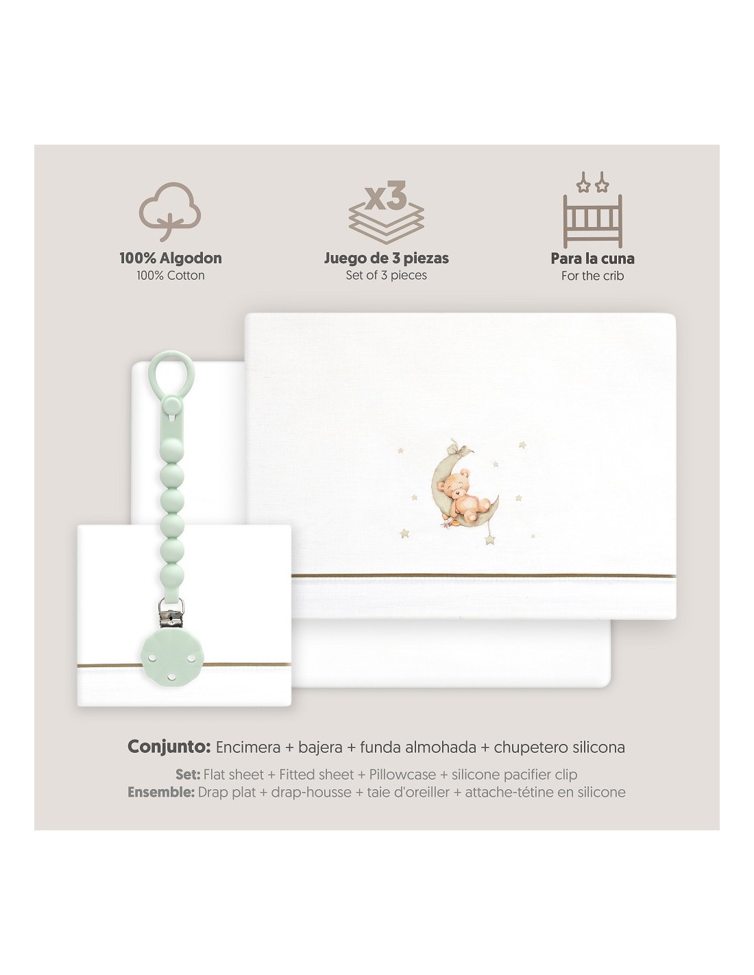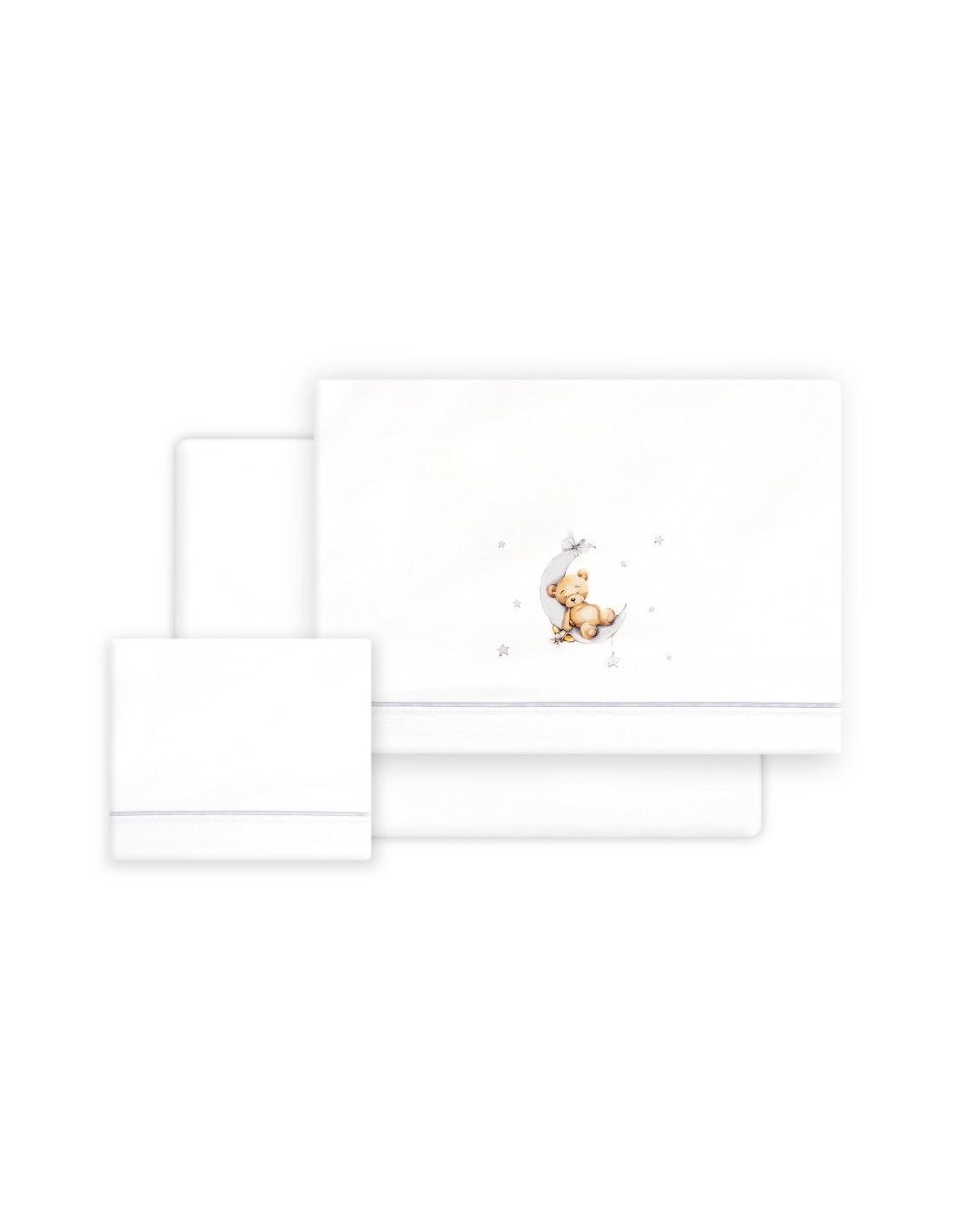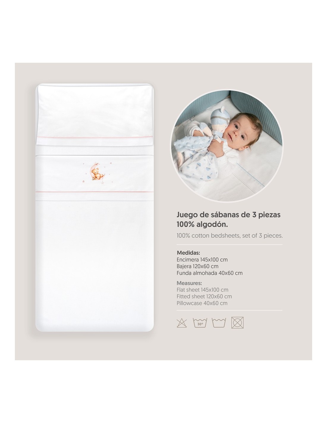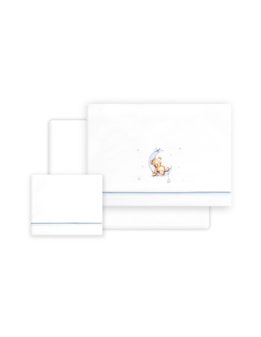 Juego de sábanas de algodón para cuna de bebé compuesto por: sábana bajera, sábana encimera y funda de almohada.