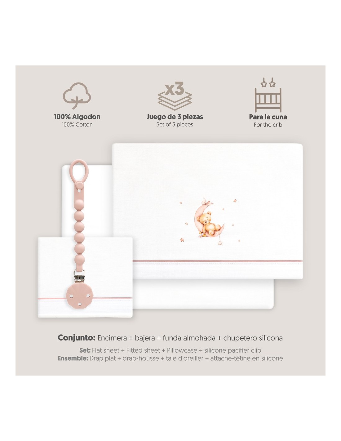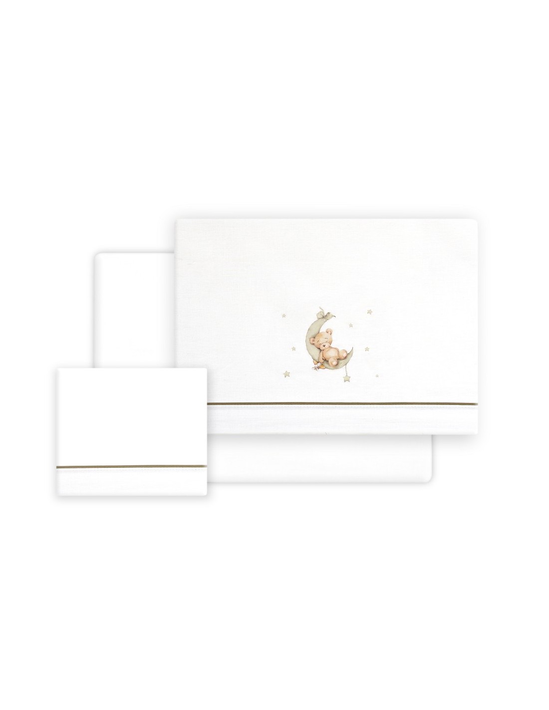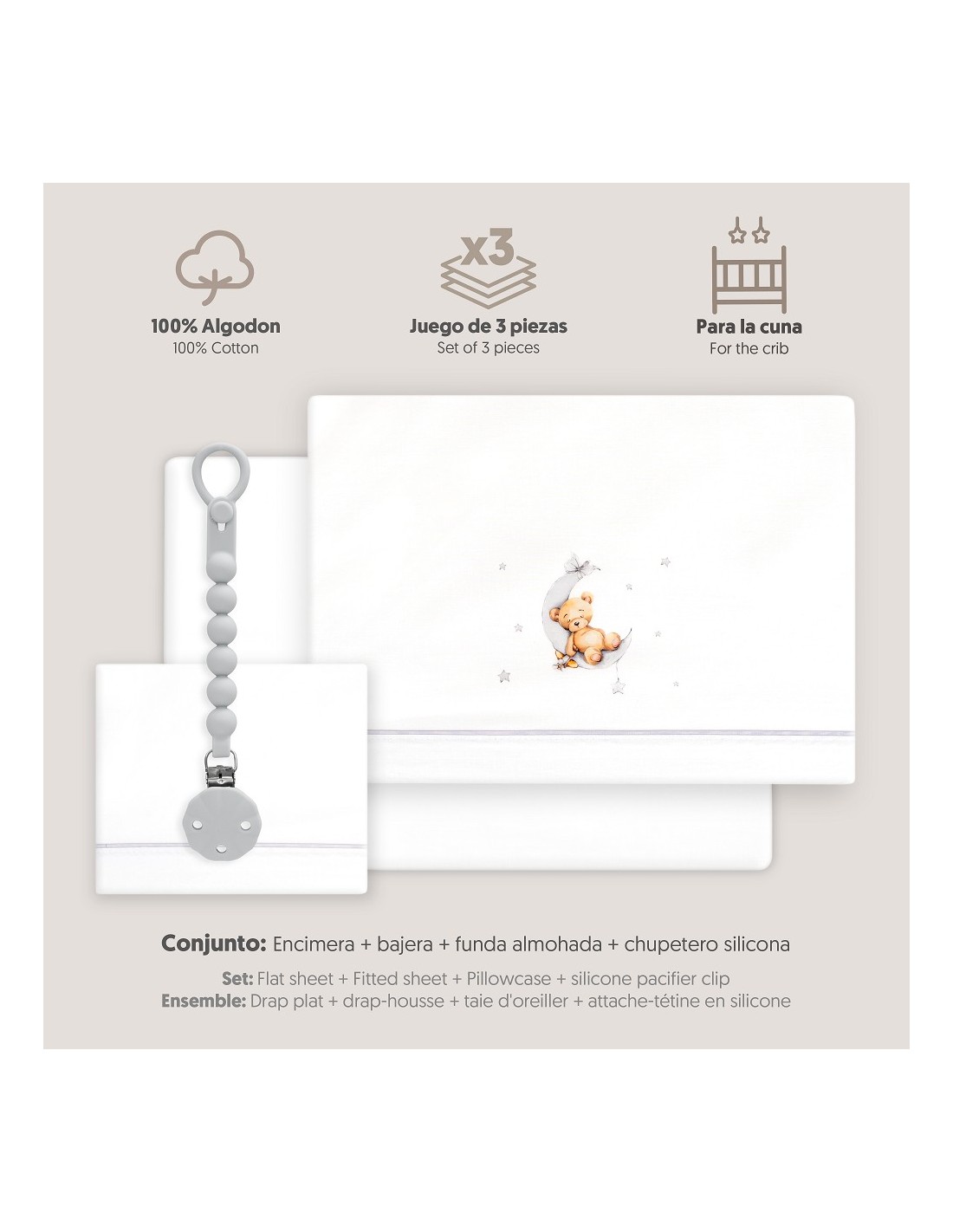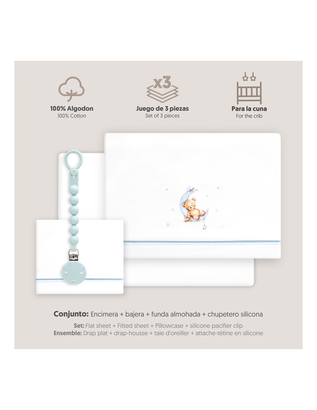 Juego de sábanas de algodón para cuna de bebé compuesto por: sábana bajera, sábana encimera y funda de almohada.