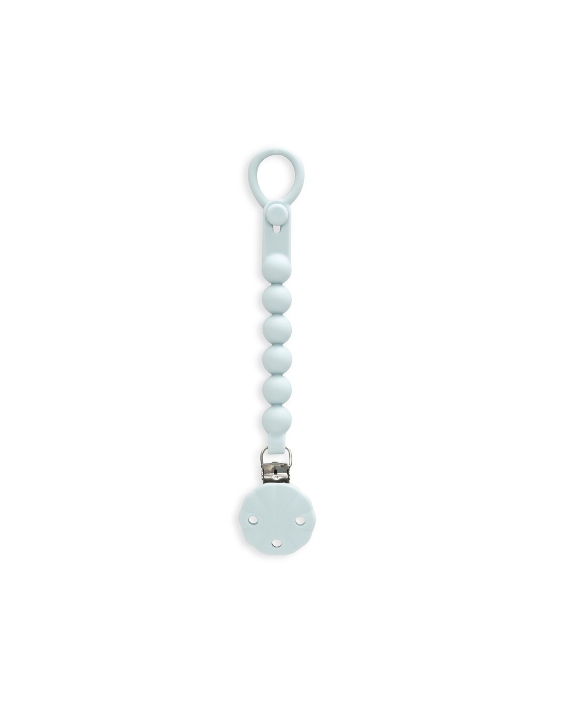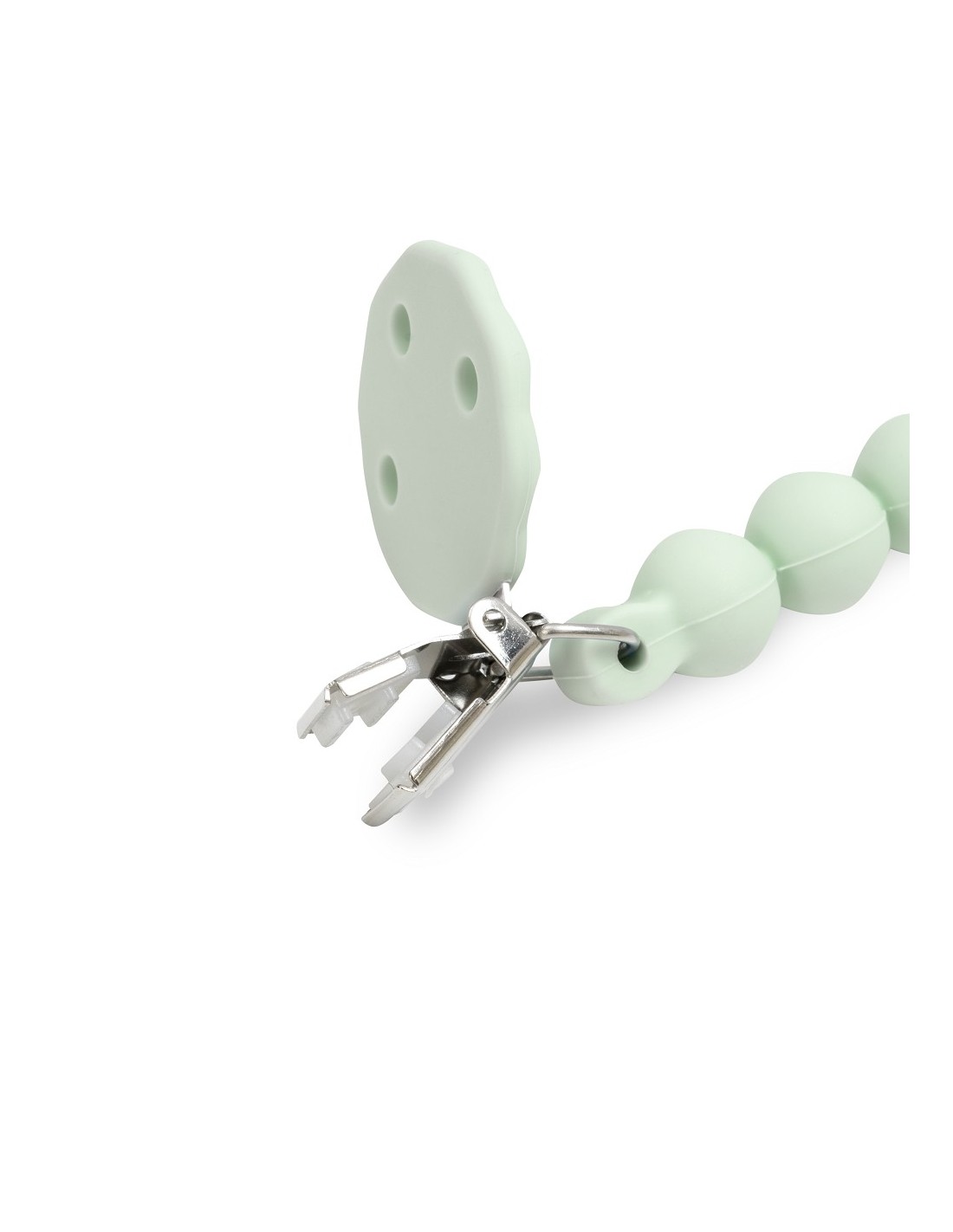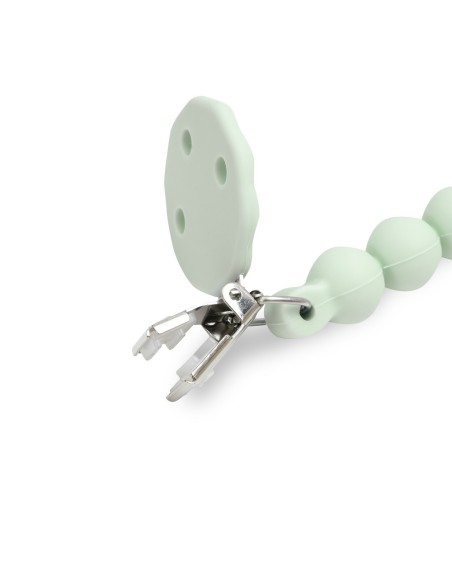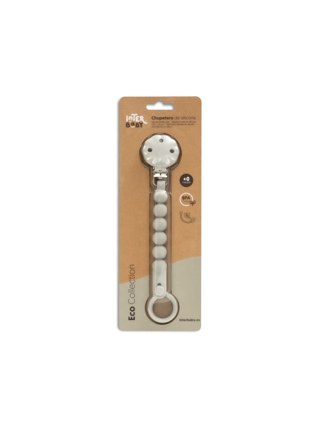 Con chupetero de silicona alimentaria. Libre de BPA, PVC, ftalatos, cadmio y plomo.