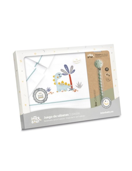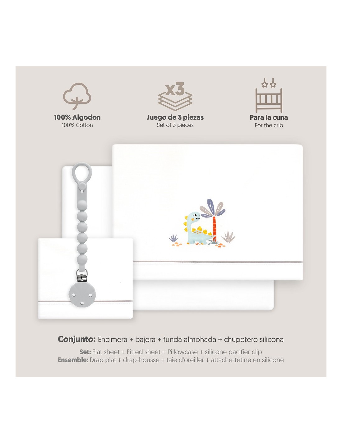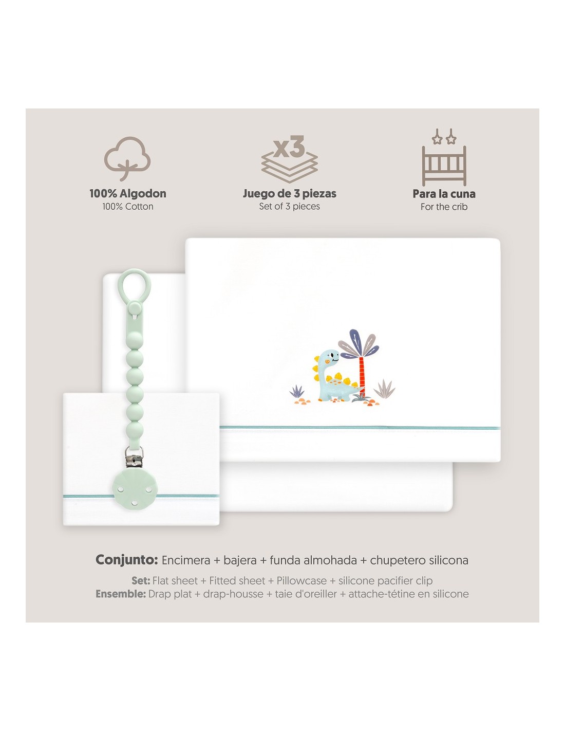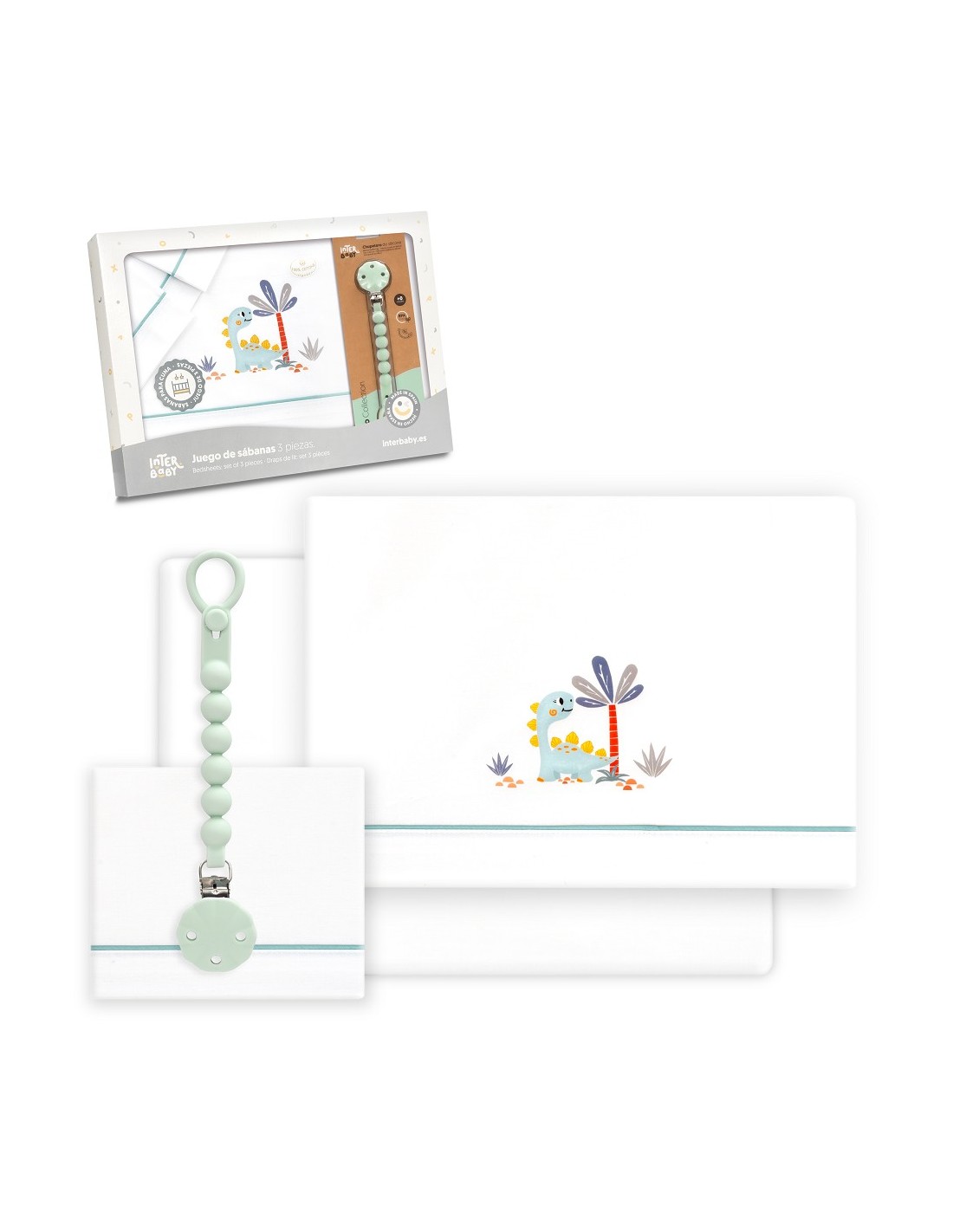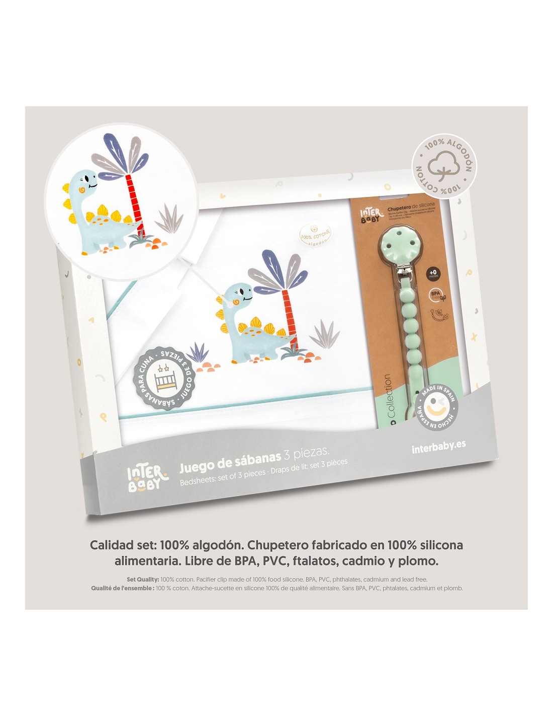Juego de sábanas para cuna con chupetero marca Interbaby dinosaurio