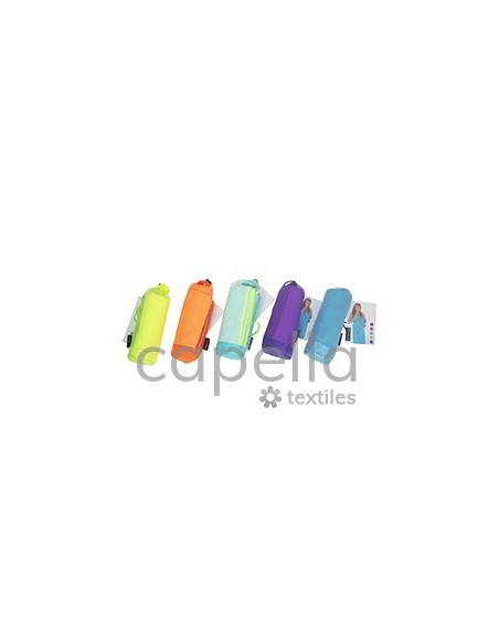 Presentada en bolsa de rejilla del mismo color que la toalla cerrada con mosquetón.