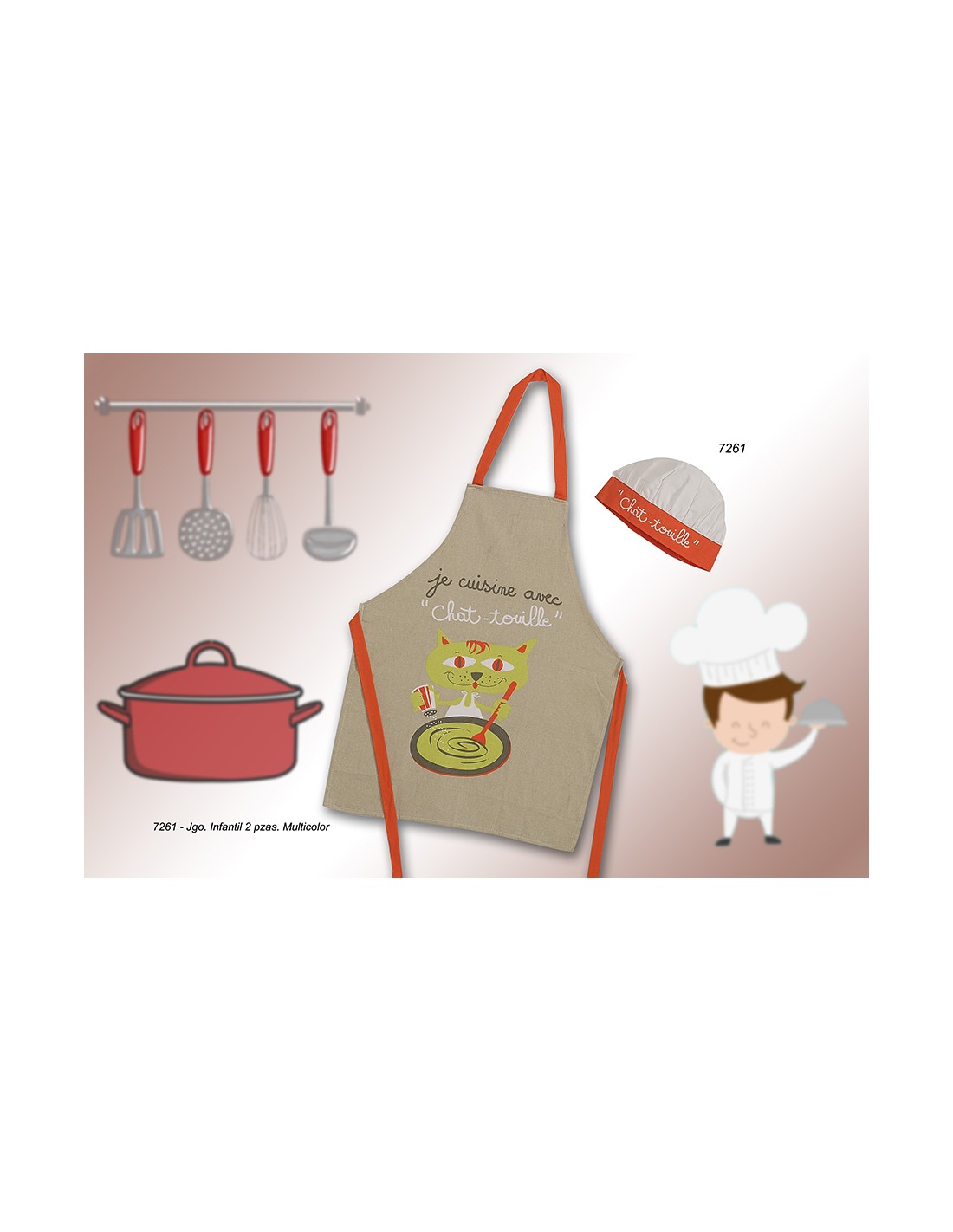 Juego infantil de 2 piezas compuesto por delantal infantil con dibujo de gato cocinando y gorro de cocina con el texto ''Chat-touille''.
