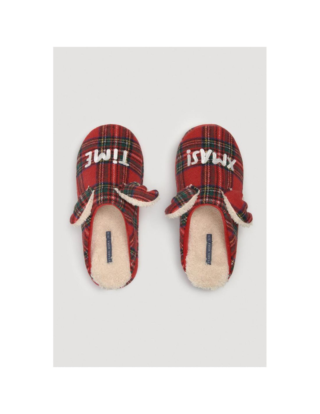 Christmas Edition. Zapatillas de casa mujer destalonada y estampado de cuadro tartán. Suaves, con tonos navideños y orejas de reno en la parte del empeine. En la parte trasera de las zapatillas el tejido es de pelo. Son divertidas de tacto extra soft e interior gustoso, cálido y cómodo. Suela rígida que se adapta perfectamente al suelo. Mismo modelo para infantil y mujer. La suela rígida con aroma a vainilla la torna todavía más cálida.